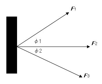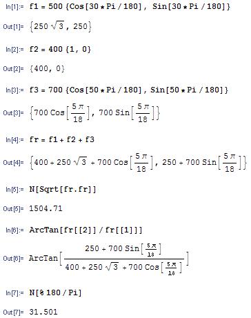 合力は、3つの力の和として得ることができます。また、この大きさは fr のノルムで与えられ、 2つのベクトルの内積を求める演算子を使用します。 合力の方向を求めるには、2つの要素の間の角度を計算します。 上記の計算結果より、fr の要素が元々正ですので、合力の方向は水平線の上31.5度となります。 このページではこのページでは Mathematica の数式処理を中心に説明します。